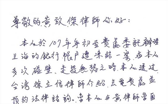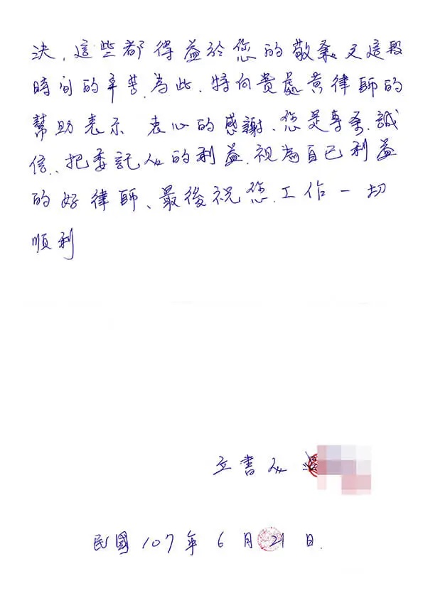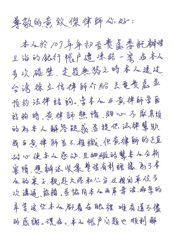 吕小姐于今年初在黄律师所属律所的协助下,向大陆寄出解除查封冻结申请书,3月收到台湾地区检察署刑事传票,并于4月份开庭,后获不起诉处分,大陆帐户也在6月初解除冻结,此次任务圆满达成,吕小姐亲笔写了感谢函来致谢律师: