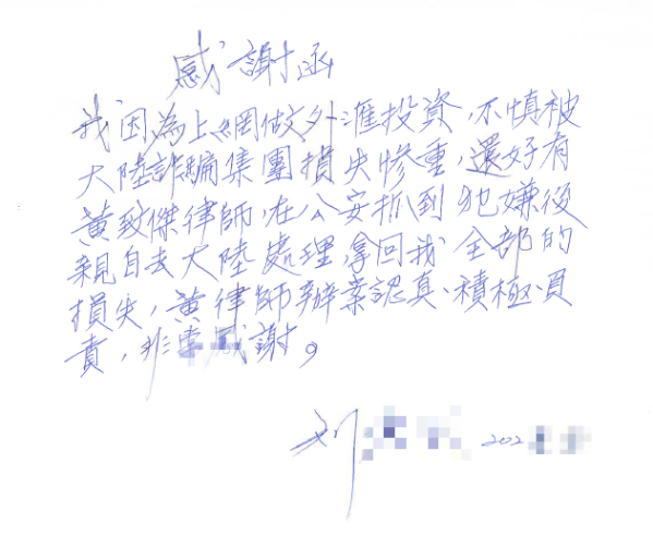 律师至大陆将委托人被诈骗金额美金两万元全数取回,