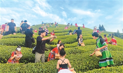 恩施的地理环境不仅造就了独特的自然景观,也促进了特色种植产业的发展。在鹤峰县走马镇的木耳山万亩茶园,两岸媒体人刚下车就被眼前一望无际、郁郁葱葱的茶山吸引,纷纷拿出手机打卡拍照。台湾东森电视台记者杨逸平在茶园拍摄了不少视频素材,并和采茶的土家族同胞交流采茶心得。“台湾有不少茶园,但规模通常比较小,很难有万亩的规模。我希望通过镜头让岛内观众更多了解大陆的茶园和茶产业,让大家了解这里的发展情况。”